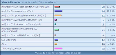 The majority (apart from those who are having pie) appear to be headed to the SLU forum, run by Cristiano, with other sizeable chunks headed for slapt.me and secondcitizen. Although I think they will all eventually migrate to SLU, as slapt.me currently has only 26 topics in their Resident Answers section, and seems to be very lightly used, while secondcitizen has a horrible orange color scheme, which no-one in their right mind (and yes, I know, we are talking about the Resident Answers crowd here) could possibly put up with for more than a day or two.