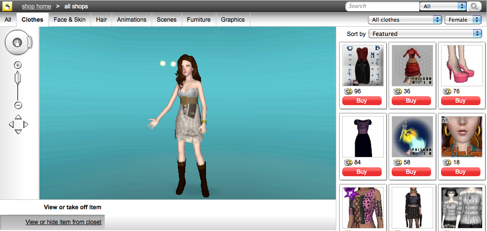 Clicking links in a 2D store is also a whole lot quicker than walking around a store (virtual or real). Of couse, it is also claimed that one of the benefits of a 3D virtual store over the regular 2D website, is that you can interact with salesfolk and other customers, and get great feedback. However, in every store I visited (and I visited over 80 in total, not just the web.alive-based stores) I never saw another soul. It was as much a ghost-town experience as I usually encounter in my visits to Second Life or the OS Grid. Could it be that sales staff only keep US office hours?