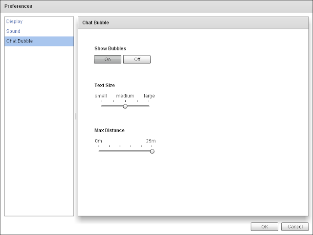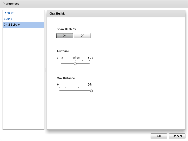 | Max Distance: | Distance that the other avatars' chat bubbles will be visible. 0m: Only your avatar's chat bubbles are visible. |