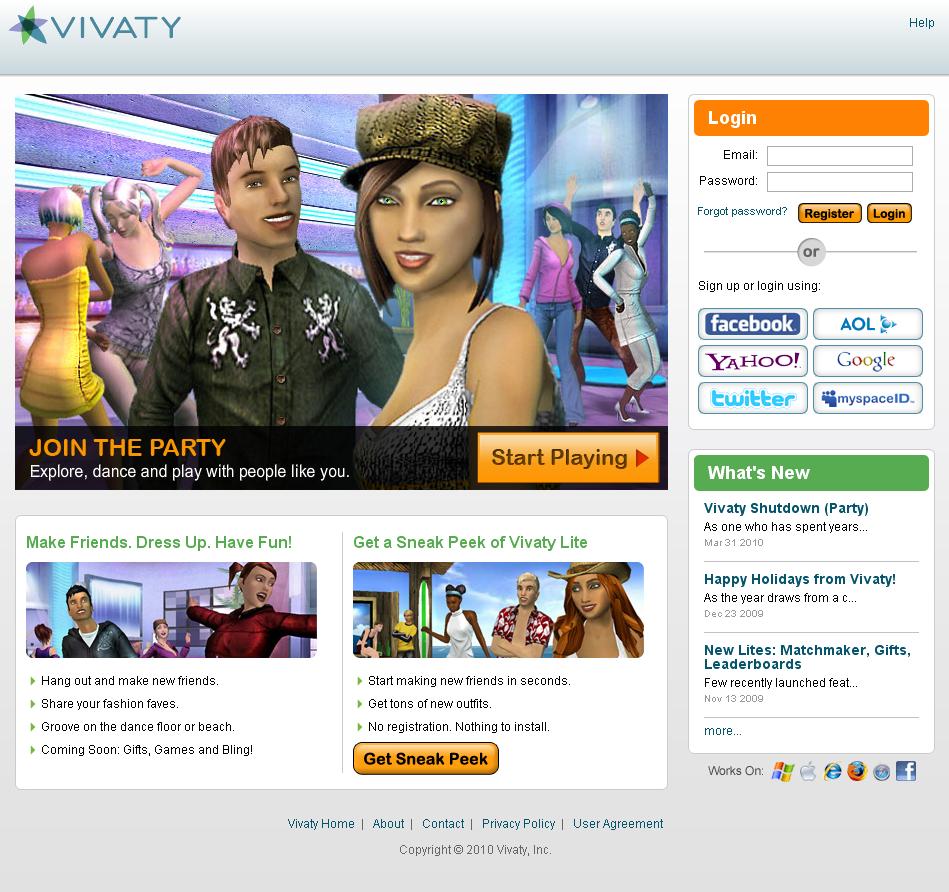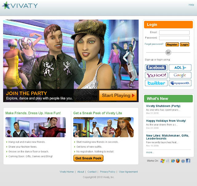Vivaty was yet another 3D Virtual Space that was spawned during the golden age of 2007-2008, who firmly believed in the 3D space concept, where people could inhabit 3D virtual rooms they could decorate, and invite friends in to join them for chat and other activities. Unlike the market leader, Second Life, Vivaty was web-based, and its scenes could be embedded in Facebook, blogs and other websites. They hoped that it could make money by selling Vivabux, the virtual currency that users could use to buy clothes for their avatars, furniture for their virtual homes, and other virtual goods and services. However, in a very frank statement, Jay Weber, Co-founder and Chief Technical Officer of Vivaty said: